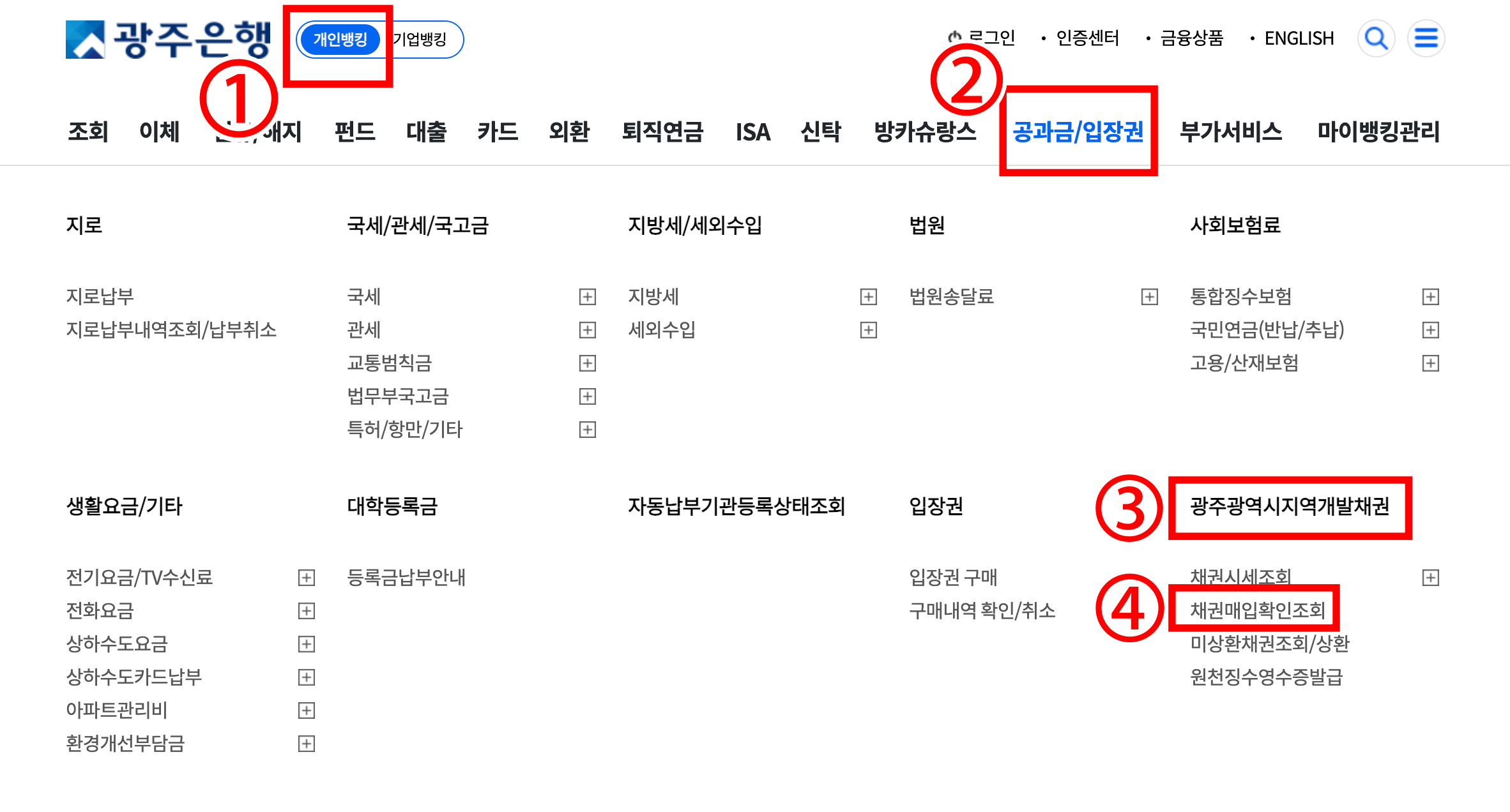 광주은행 홈페이지 → ①개인뱅킹 → ②공과금/입장권 → ③광주광역시지역개발채권 → ④채권매입확인조회